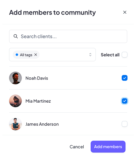 Clients can browse community groups they have been invited to, see fellow members, and interact—building a sense of belonging that keeps them coming back.