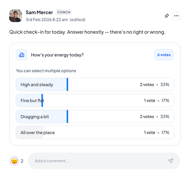 Ask your community what they think. Polls make it easy to gather opinions, plan challenges, or let clients vote on what comes next.