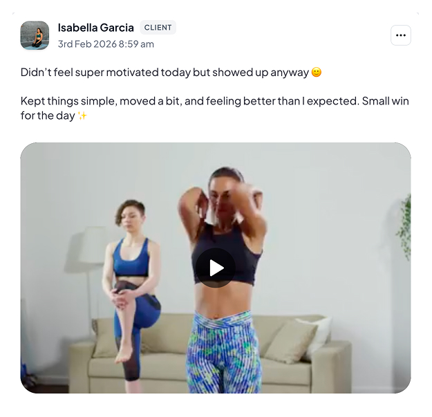 Post workout demos, coaching tips, or motivational clips right inside the community. No external links needed—clients watch without leaving the app.