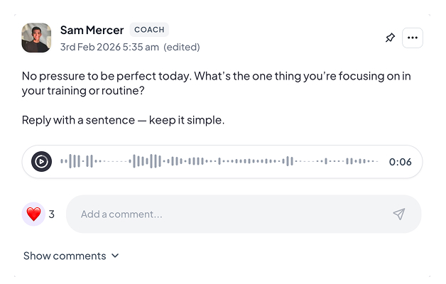 Coaches and clients can record and listen to voice notes within threads, adding a personal touch to every conversation.