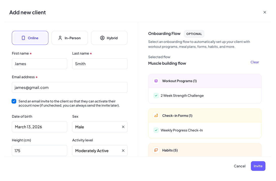 When inviting new clients, select an onboarding flow from the dropdown. Everything in the flow is auto-assigned the moment they join—no extra steps.