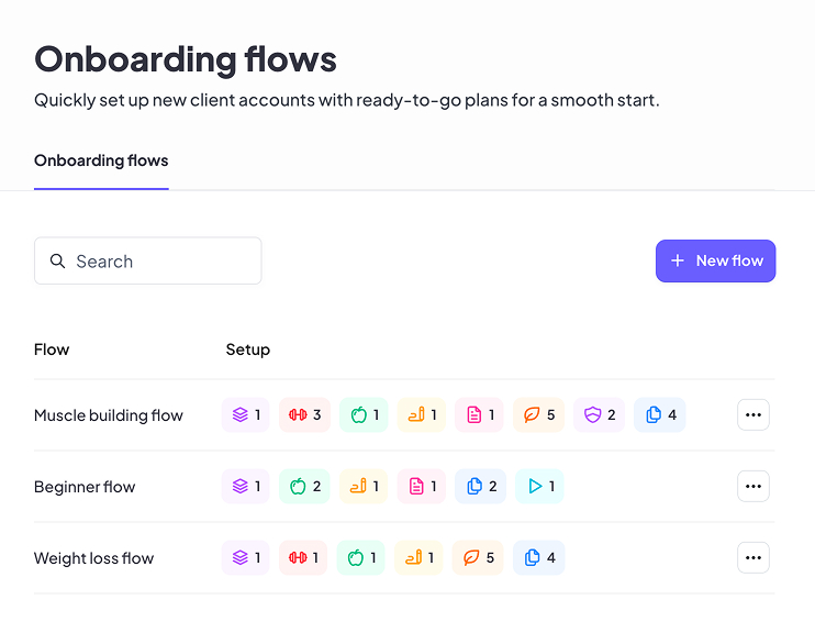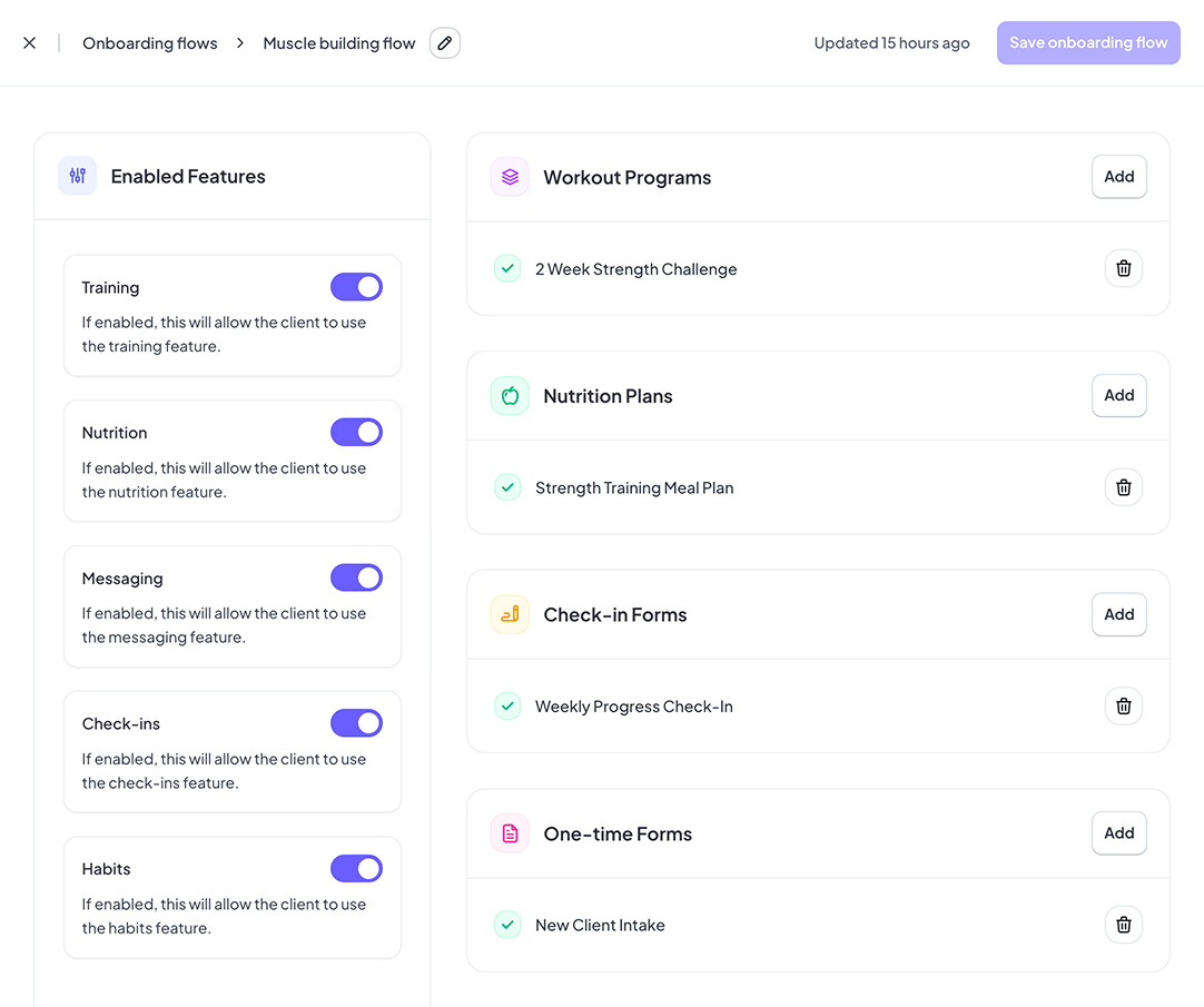 Create onboarding flows by adding workout programs, meal plans, check-in forms, vault resources, habits, and more—all in one template that runs automatically.